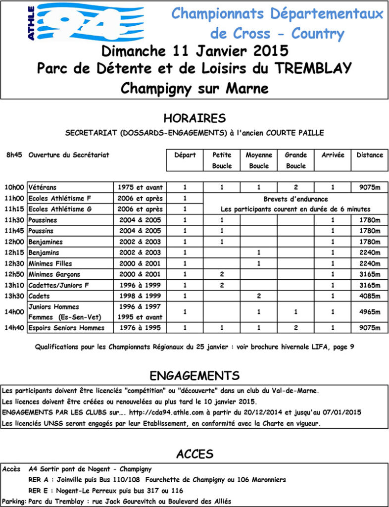 Nous sommes 15 coureurs à défendre les couleurs de l’ES Sucy pour ces championnats départementaux de cross, qui ont lieu au Parc du Tremblay à Champigny. Le parcours consiste en 2 boucles dans le parc. Comme tous les ans il fait bien froid mais cette année il y a un beau soleil. Et comme au cross de Sucy ça part à fond, et je finis dans les derniers.