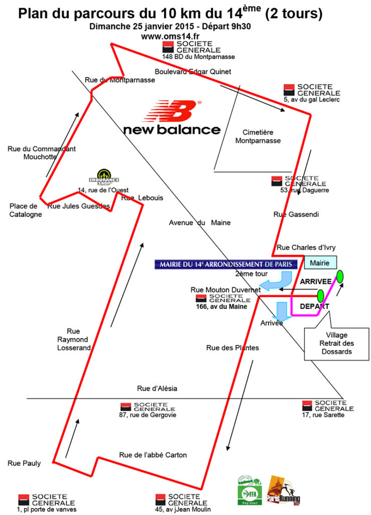 Parcours en 2 boucles dans les rues du 14e, avec quelques faux-plats.