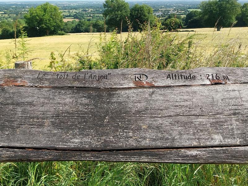 Mais voilà que j’apprends en consultant la page Strava de Michaël Corcolle qu’il a atteint une pancarte qui indique le « toit de l’Anjou » à 216 m d’altitude. Étrange je n’ai pas vu cette pancarte. Je fais des recherches sur internet et je vois qu’elle n’est qu’à quelques hectomètres de l’endroit où j’étais. Bon va falloir vérifier ça !