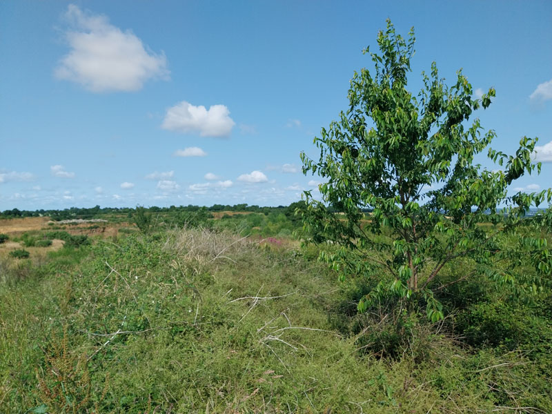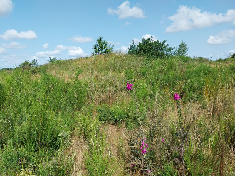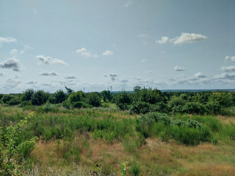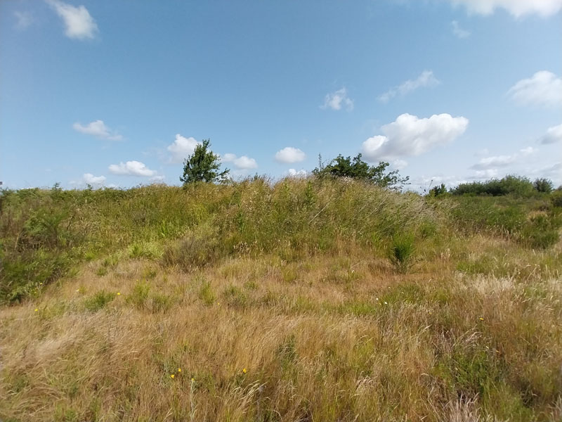 Toujours à pied je me dirige ensuite sur la petite route qui mène à ce fameux « toit de l’Anjou », que j’atteint après 500 m de marche. La pancarte a été installée là car on a une superbe vue sur la vallée. Elle indique l’altitude de 216 m. Ce qui est bizarre c’est qu’on en fait pas mention sur la carte IGN et que en plus si on continue sur cette route ça monte encore. Je continue donc à marcher et il se trouve que du côté droit, derrière un haut grillage, il y a une butte qui me semble plus élevée. Un peu plus loin il y a l’entrée de cette propriété et je peux facilement me glisser derrière le portail. Je suis un chemin puis monte sur la butte et me dirige à travers les herbes et la végétation pour atteindre le point culminant de cette zone. Je ressors par le même chemin, repasse près de la pancarte et rejoins ma voiture. Je vais manger à Chemillé-en-Anjou, retrouve des passagers BlaBlaCar et nous repartons sur Paris.