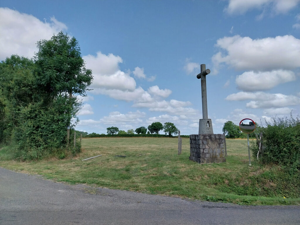 Un sommet très facile, il me suffit de ma garer à un croisement sur la D133, là il y a une antenne et une croix en pierre. Je marche un peu le long d’un chemin en terre, le sommet indiqué sur la carte IGN se trouve dans le champs. Je me déplace dans le secteur en faisant des photos, dans le champ à côté et le long d’une haie où il me semble que ça monte légèrement. Mission accomplie !