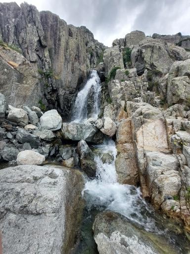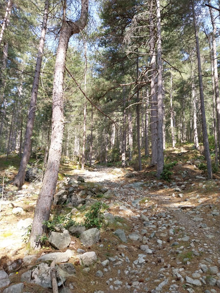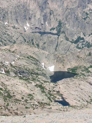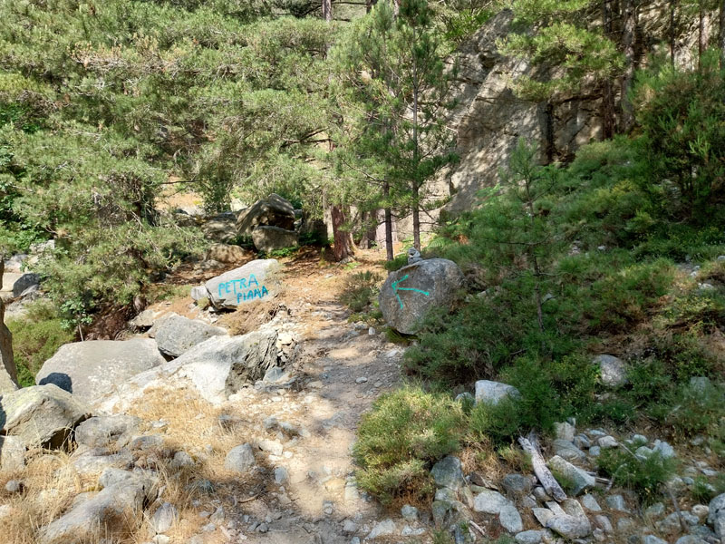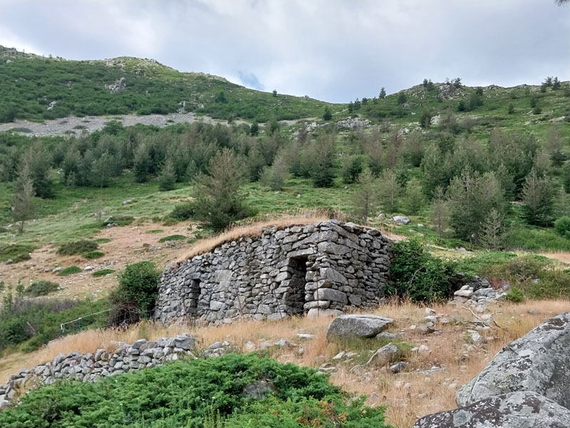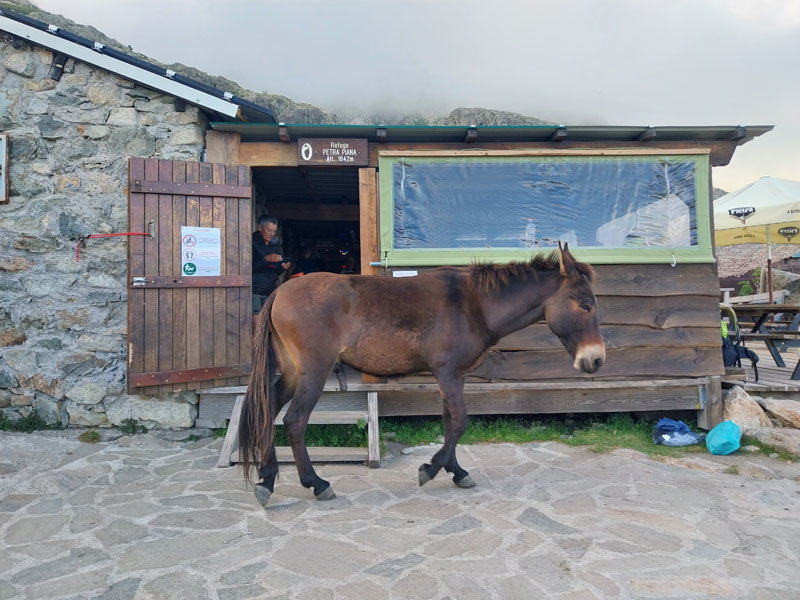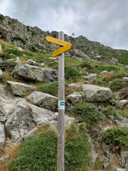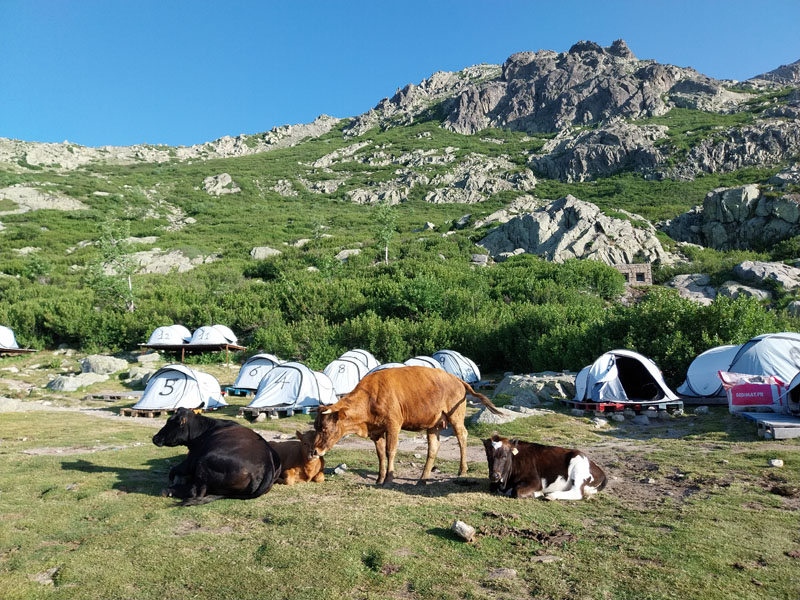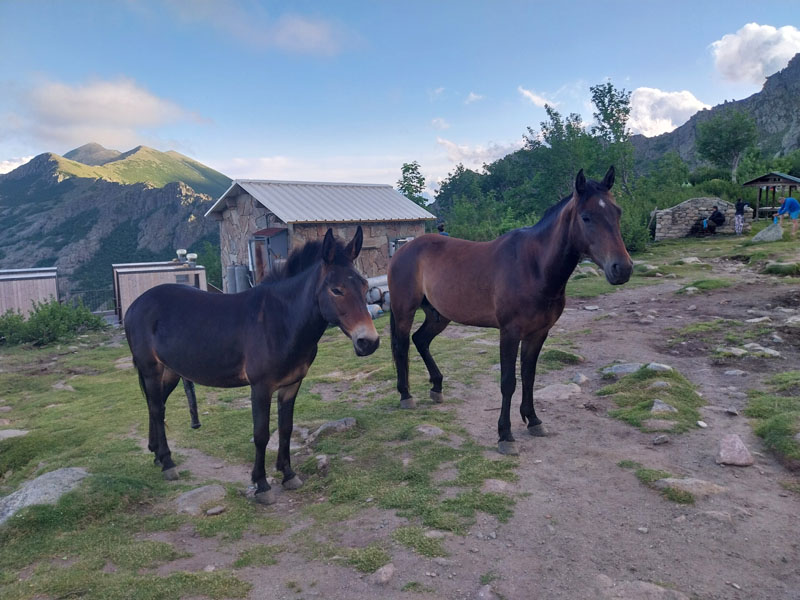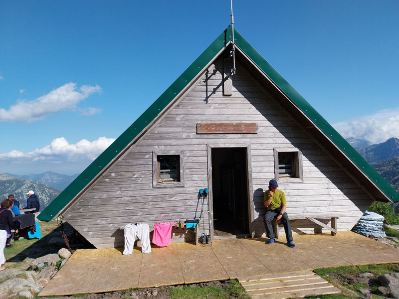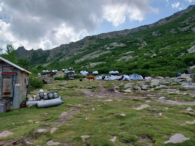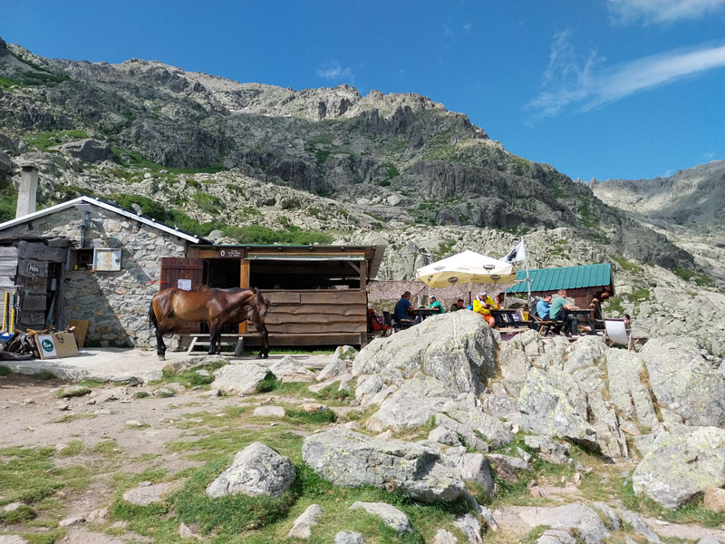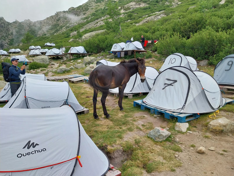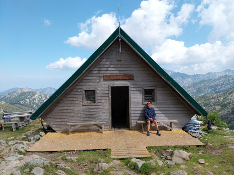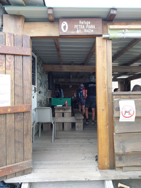 Le lendemain, après une petite heure de voiture, nous voici garés au bout de la petite route, au-dessus de la bergerie de Puzzatello, où démarre le sentier qui va nous mener au refuge de Petra Piana. L’année dernière nous avions mis 5 h pour l’atteindre, cette année c’est quasiment 6 h ! Hé oui le poids des ans… Le poids tout court même… ! Pascal va s’installer dans le dortoir et moi dans une des tentes que loue le refuge. Il y a beaucoup de monde avec tous les randonneurs du GR20. Le soir le repas est exactement le même que l’année dernière (ratatouille froide, lentilles aux lardons, mousse au chocolat) ! Pendant la nuit le vent se lève et il fait très froid, j’ai beau me couvrir, pantalon, polaire et gore-tex, avec mon petit sac de couchage en polaire j’ai froid et dors très mal. De plus j’ai peur que ça soit la tempête et qu’on ne puisse pas grimper, comme l’année précédente. Finalement au matin Pascal vient me rejoindre à la tente, il fait beau quoique encore assez froid. Nous allons déjeuner et nous nous préparons pour l’ascension. Comme nous avons prévu de redormir au refuge, nous pouvons y laisser des affaires et nous partons le sac léger.