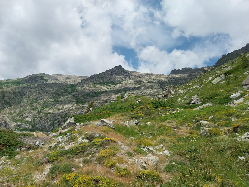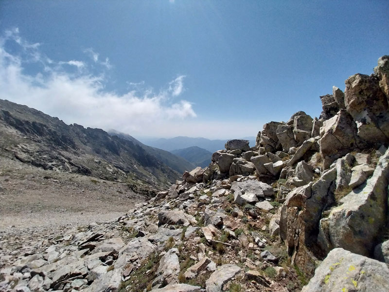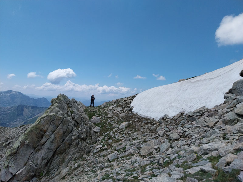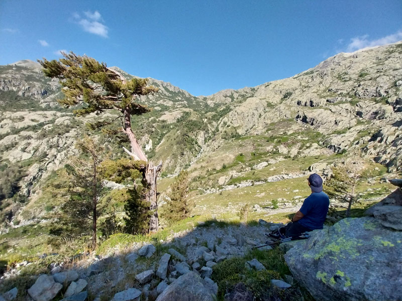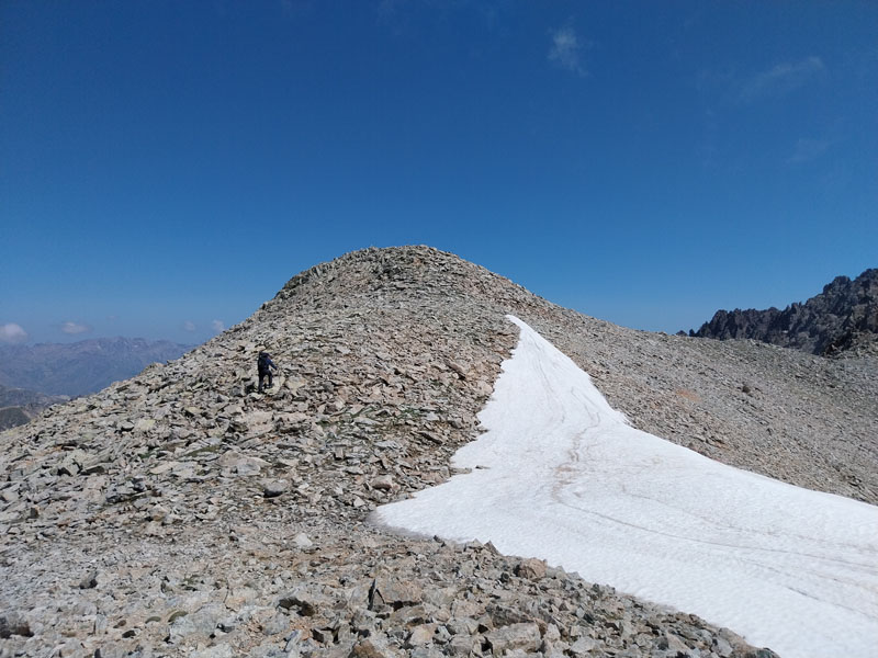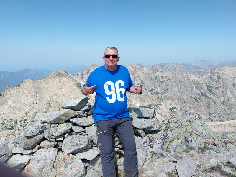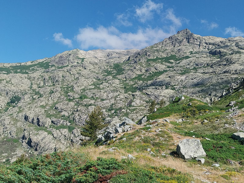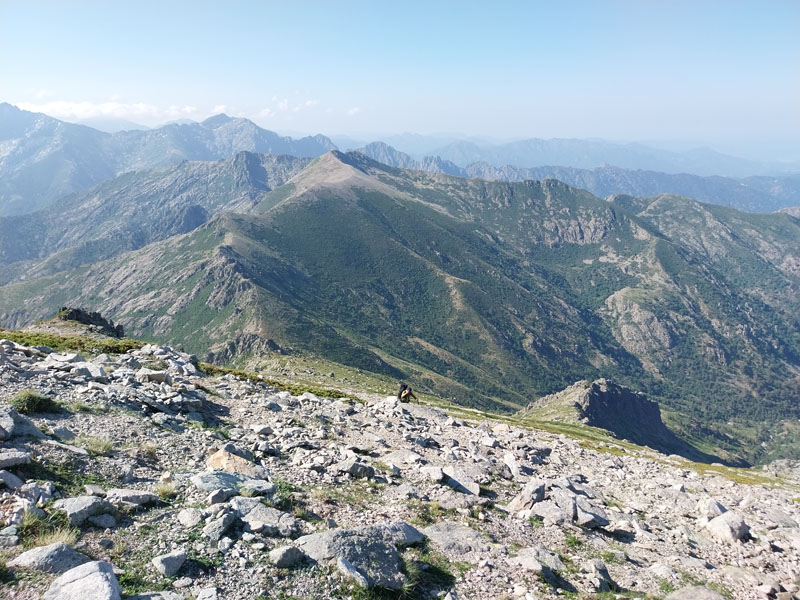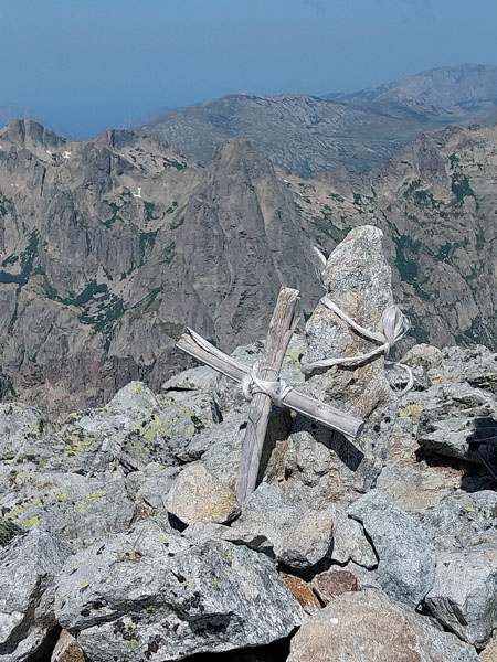 C’est le jour J ! Il y a un beau soleil, on va avoir chaud. Dès que nous sortons du campement ça monte tout de suite dans un sentier très difficile, très accidenté avec des rochers. Au bout de ¾ h le sentier bascule vers un autre versant. Mais c’est là que nous le quittons pour partir hors-sentier, plein nord en suivant la crête qui délimite les 2 départements. Ça grimpe dur dans la caillasse et une maigre végétation. Au bout de ce raidillon nous sommes à une sorte de col. Je pars pour continuer sur la crête mais ce sont des gros blocs qu’il faut franchir en s’aidant des mains. Pascal préfère descendre un peu de l’autre côté du col et contourner la crête sur le versant est. Je le laisse faire, il sera plus à l’aise. Je pars sur la crête et j’avance tant bien que mal dans les rochers, tandis que je vois Pascal plus bas évoluant dans un champ de caillasse. Je suis proche de l’antécime, premier objectif de l’ascension, et lui signale qu’il s’éloigne et lui demande de me rejoindre. Je continue à grimper et atteins l’antécime Sud de A Maniccia (2425 m) qui est le point culminant de la Corse-du-Sud, symbolisé par un gros cairn. Ça y est, après 23 ans d’efforts et de persévérance, je viens de boucler mon challenge SDF, concernant les 96 points culminants de France métropolitaine ! Je suis satisfait certes, fier même ! Mais je ne réalise pas vraiment. J’aurais pu laisser exploser ma joie ou verser une petite larme, mais non, je reste serein. Ma joie est intérieure, je savoure…