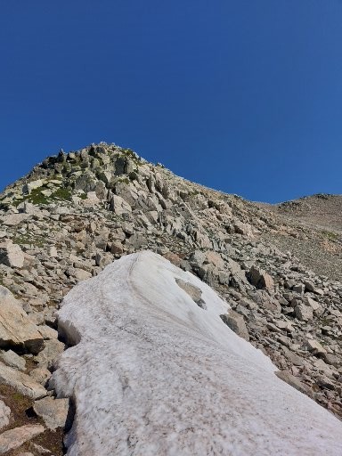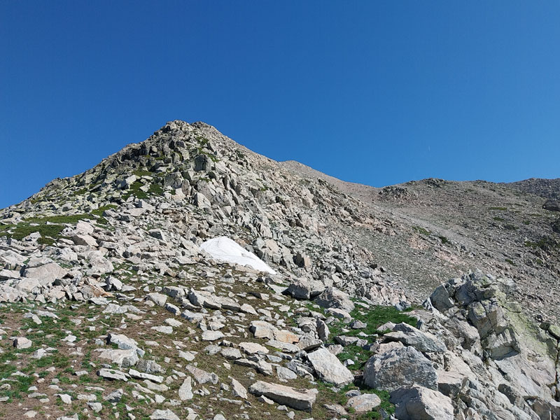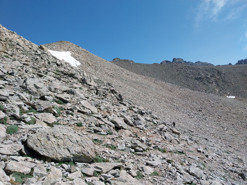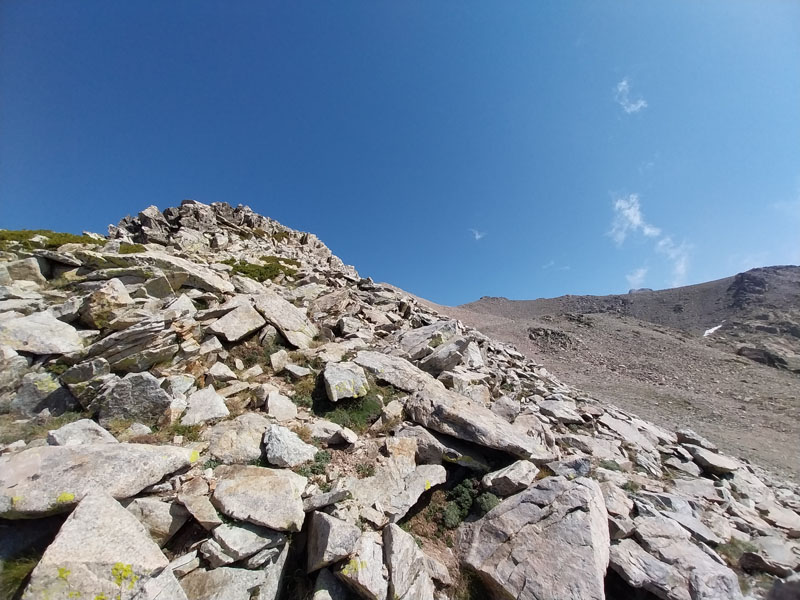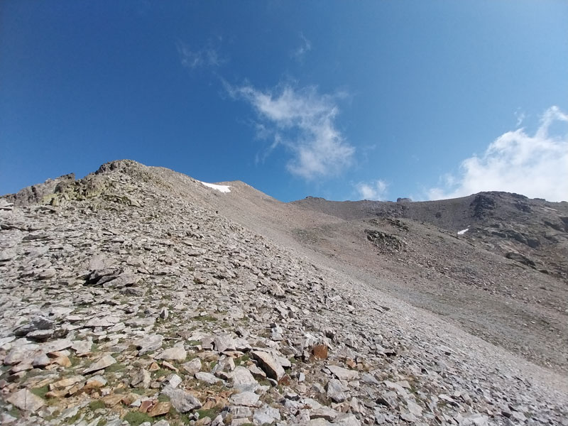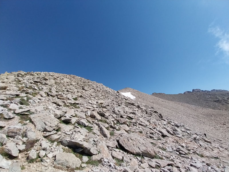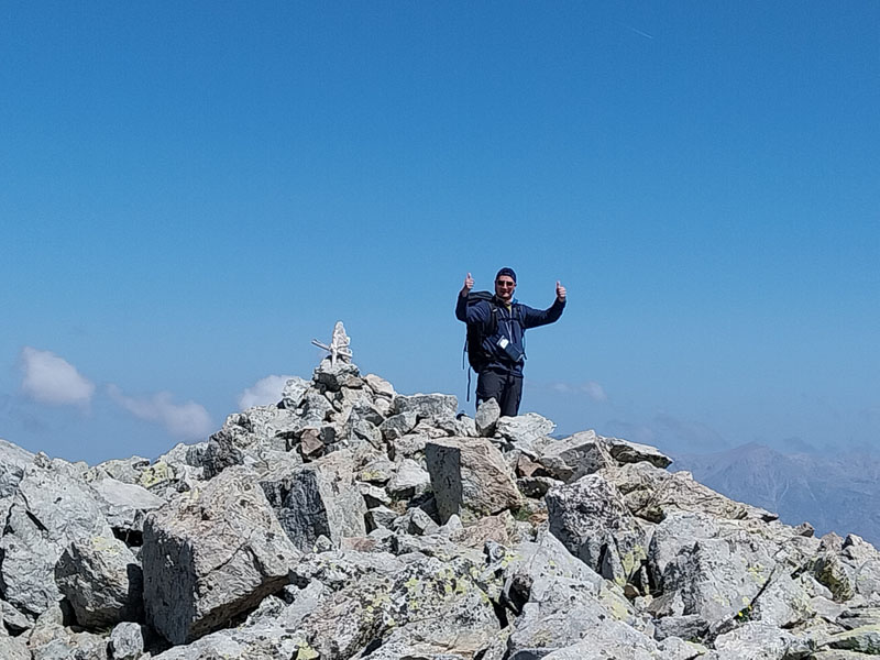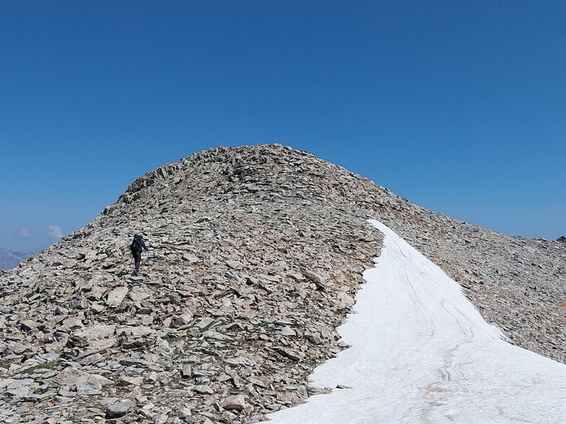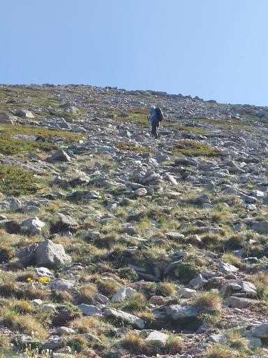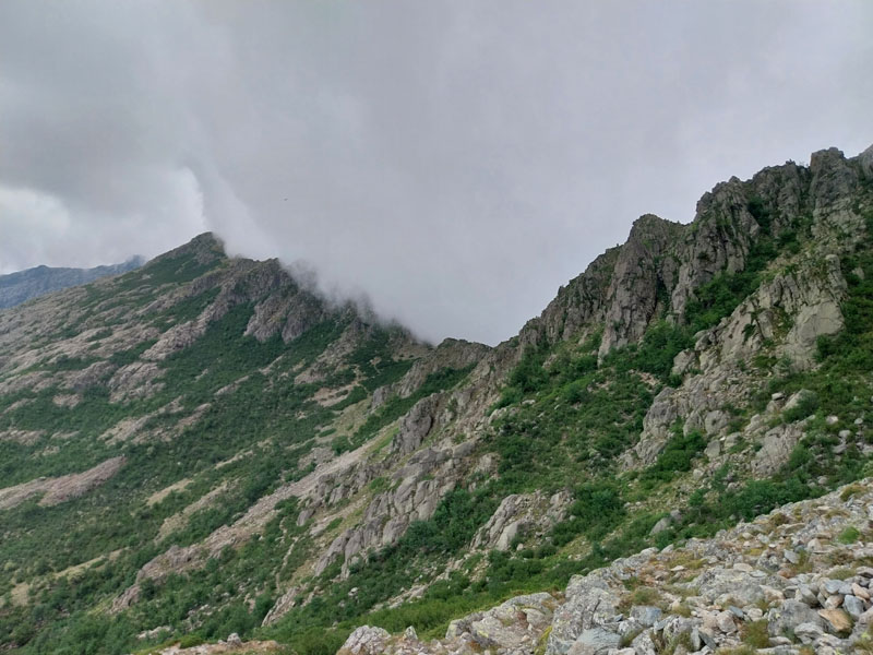 C’est le jour J ! Il y a un beau soleil, on va avoir chaud. Dès que nous sortons du campement ça monte tout de suite dans un sentier très difficile, très accidenté avec des rochers. Au bout de ¾ h le sentier bascule vers un autre versant. Mais c’est là que nous le quittons pour partir hors-sentier, plein nord en suivant la crête qui délimite les 2 départements. Ça grimpe dur dans la caillasse et une maigre végétation. Au bout de ce raidillon nous sommes à une sorte de col. Je pars pour continuer sur la crête mais ce sont des gros blocs qu’il faut franchir en s’aidant des mains. Pascal préfère descendre un peu de l’autre côté du col et contourner la crête sur le versant est. Je le laisse faire, il sera plus à l’aise. Je pars sur la crête et j’avance tant bien que mal dans les rochers, tandis que je vois Pascal plus bas évoluant dans un champ de caillasse. Je suis proche de l’antécime, premier objectif de l’ascension, et lui signale qu’il s’éloigne et lui demande de me rejoindre. Je continue à grimper et atteins l’antécime Sud de A Maniccia (2425 m) qui est le point culminant de la Corse-du-Sud, symbolisé par un gros cairn. Ça y est, après 23 ans d’efforts et de persévérance, je viens de boucler mon challenge SDF, concernant les 96 points culminants de France métropolitaine ! Je suis satisfait certes, fier même ! Mais je ne réalise pas vraiment. J’aurais pu laisser exploser ma joie ou verser une petite larme, mais non, je reste serein. Ma joie est intérieure, je savoure…