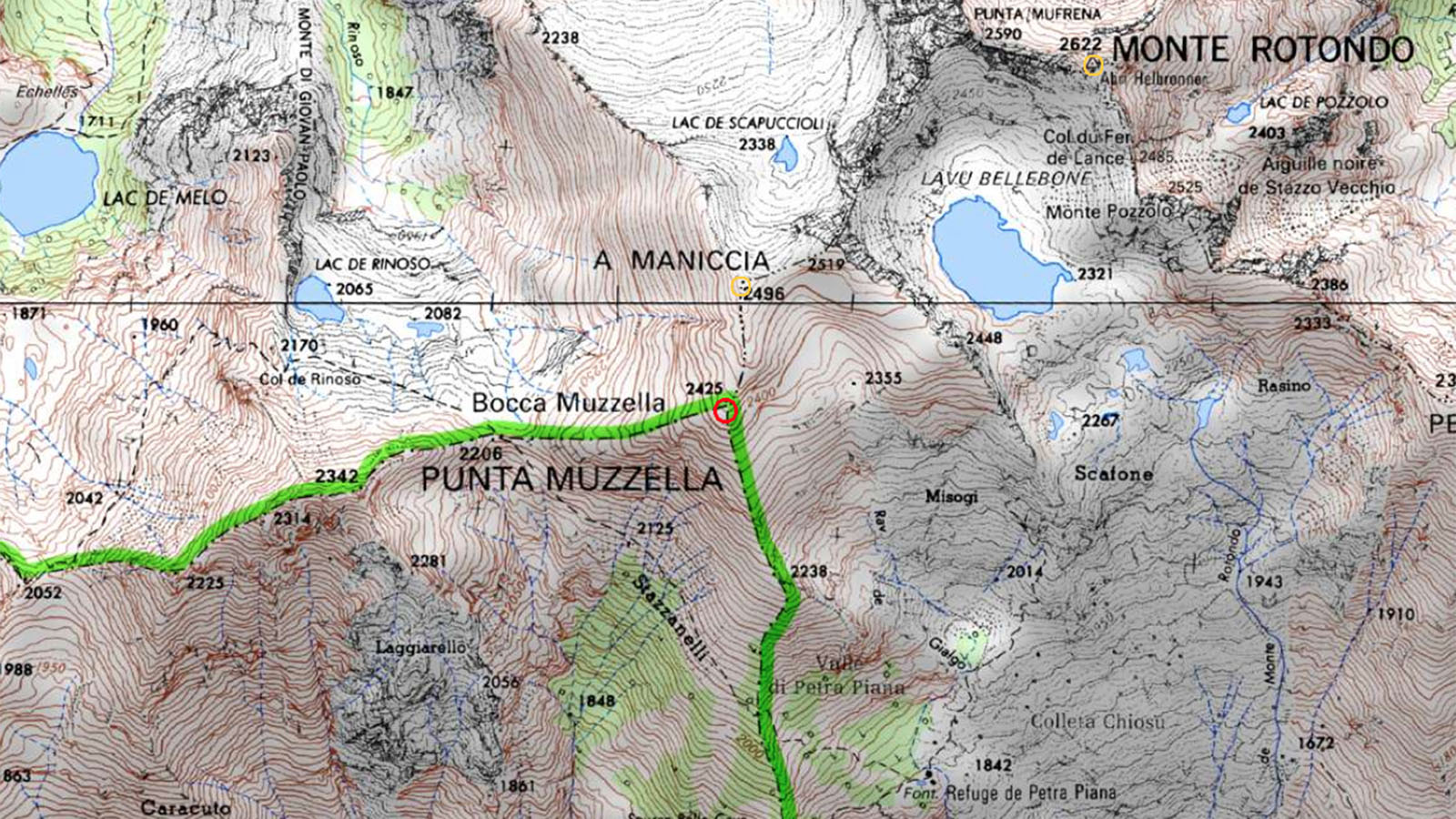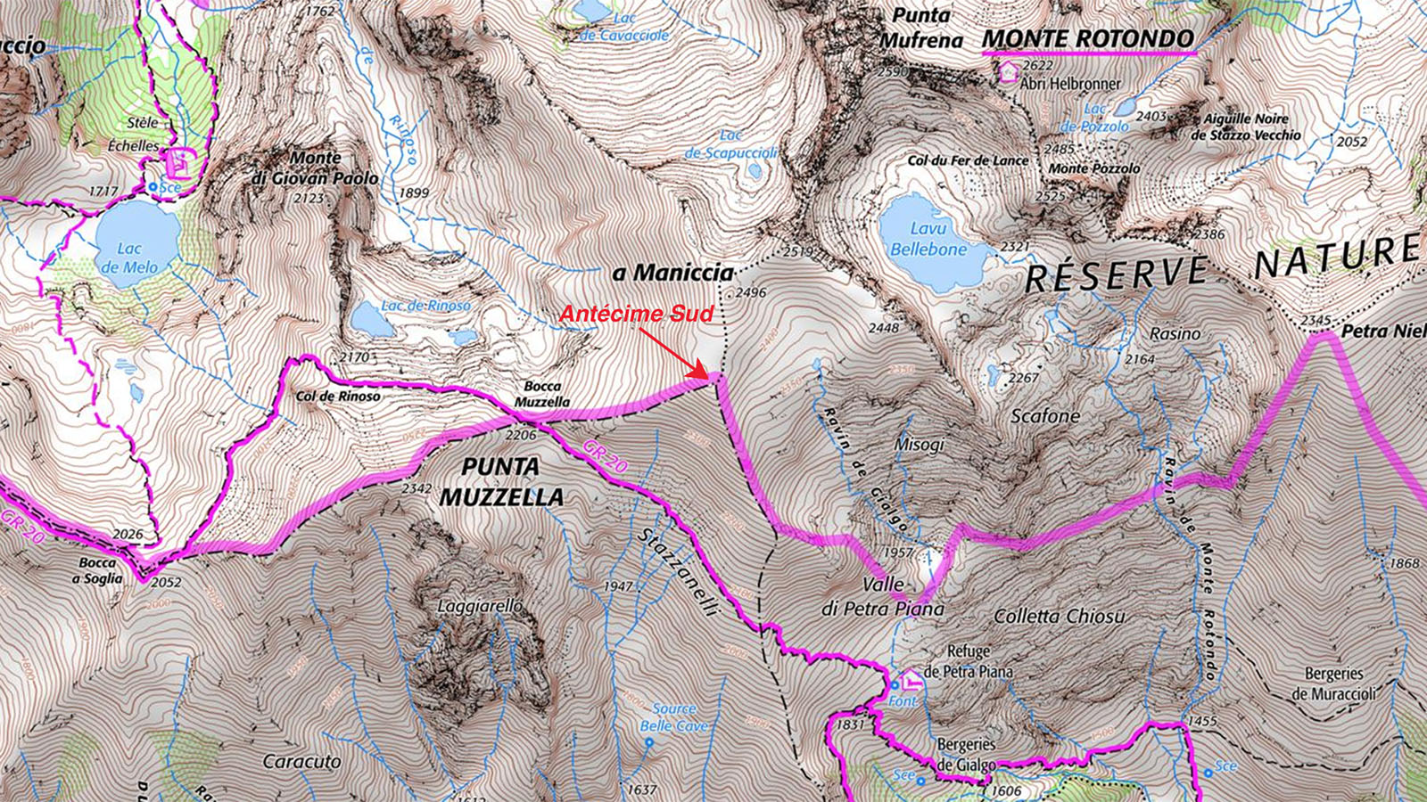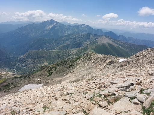 Direction ensuite le sommet même de la montagne, que l’on voit pas très loin, et avec une pente nettement moins raide. En un bon ¼ h nous sommes au sommet de A Maniccia (2496 m), qui se trouve en Haute-Corse. 3 heures que nous sommes partis du refuge. Re-photos, congratulations, pique-nique. Nous pouvons voir le Monte Rotondo de l’autre côté d’un cirque, nous l’avions envisagé mais ça nous parait trop long et difficile. Le but maintenant est de redescendre tranquillement et sans nous blesser. Nous suivons la combe qu’a pris Pascal à l’aller, une véritable mer de caillasse et de pierraille. Certes la descente est plus facile mais je suis très prudent, je ne voudrais pas me faire une entorse. Nous rejoignons le petit col et la crête qui nous ramène au sentier du GR20, où l’on retrouve les randonneurs, qui vont soit vers le Nord ou vers le Sud. Pendant notre ascension, dès que nous sommes sortis du sentier nous n’avons plus croisé personne. Puis c’est la descente vers le refuge. Je trouve quand même le moyen de chuter 2 fois dans cette descente ! Bon c’est sans gravité et en plus une charmante randonneuse m’aide à me relever… Mais on le dit toujours : en montagne 80% des accidents arrivent à la descente.