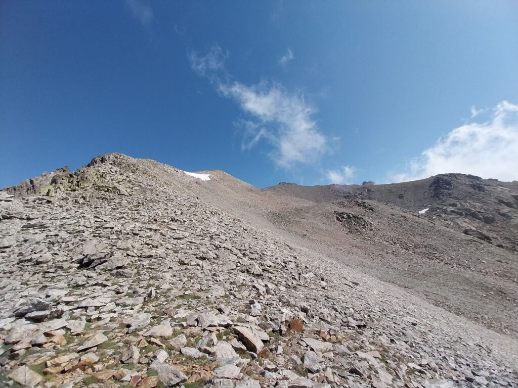 C’est le jour J ! Il y a un beau soleil, on va avoir chaud. Dès que nous sortons du campement ça monte tout de suite dans un sentier très difficile, très accidenté avec des rochers. Au bout de ¾ h le sentier bascule vers un autre versant. Mais c’est là que nous le quittons pour partir hors-sentier, plein nord en suivant la crête qui délimite les 2 départements. Ça grimpe dur dans la caillasse et une maigre végétation. Au bout de ce raidillon nous sommes à une sorte de col. Je pars pour continuer sur la crête mais ce sont des gros blocs qu’il faut franchir en s’aidant des mains. Pascal préfère descendre un peu de l’autre côté du col et contourner la crête sur le versant est. Je le laisse faire, il sera plus à l’aise. Je pars sur la crête et j’avance tant bien que mal dans les rochers, tandis que je vois Pascal plus bas évoluant dans un champ de caillasse. Je suis proche de l’antécime, premier objectif de l’ascension, et lui signale qu’il s’éloigne et lui demande de me rejoindre. Je continue à grimper et atteins l’antécime Sud de A Maniccia (2425 m) qui est le point culminant de la Corse-du-Sud, symbolisé par un gros cairn. Ça y est, après 23 ans d’efforts et de persévérance, je viens de boucler mon challenge SDF, concernant les 96 points culminants de France métropolitaine ! Je suis satisfait certes, fier même ! Mais je ne réalise pas vraiment. J’aurais pu laisser exploser ma joie ou verser une petite larme, mais non, je reste serein. Ma joie est intérieure, je savoure…