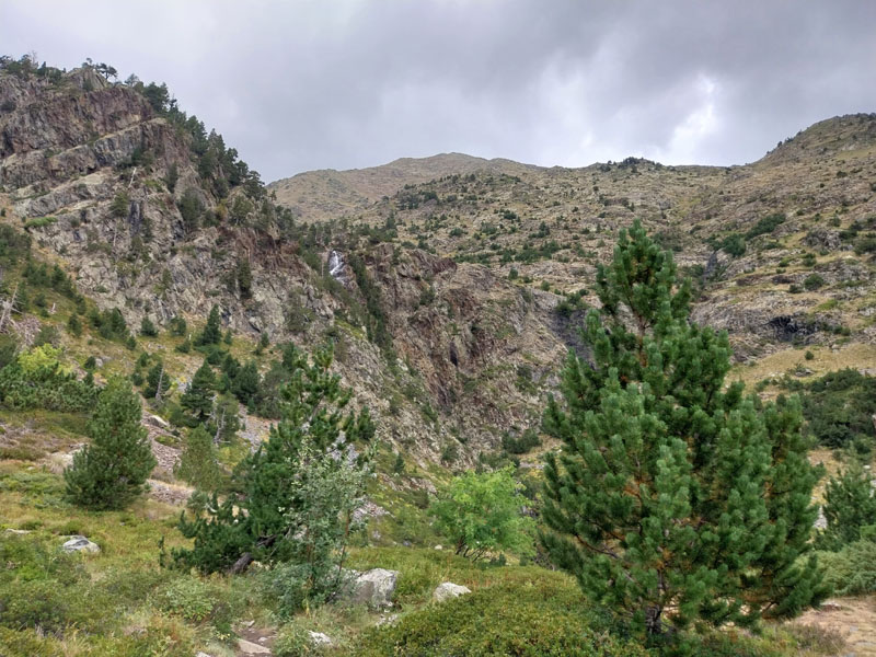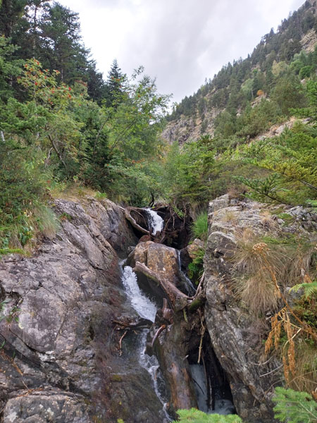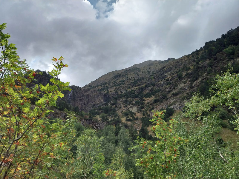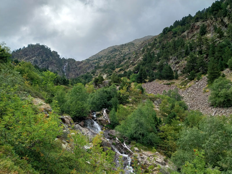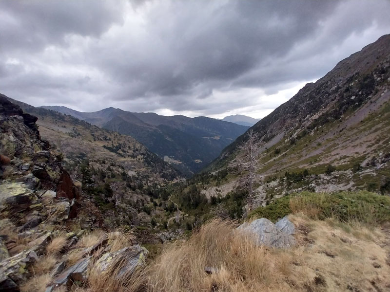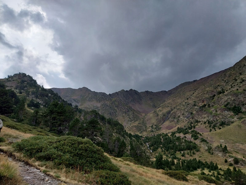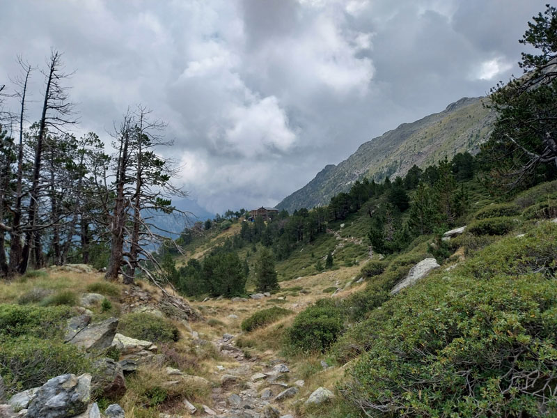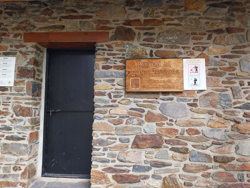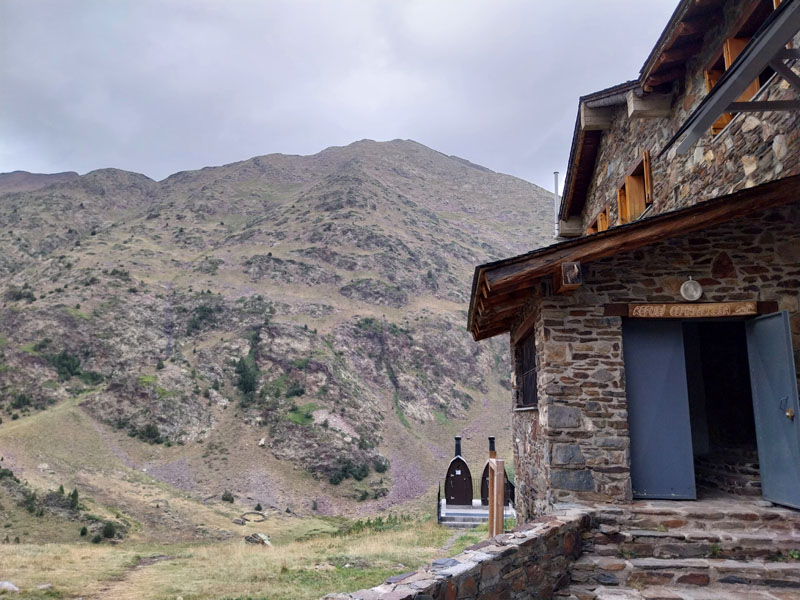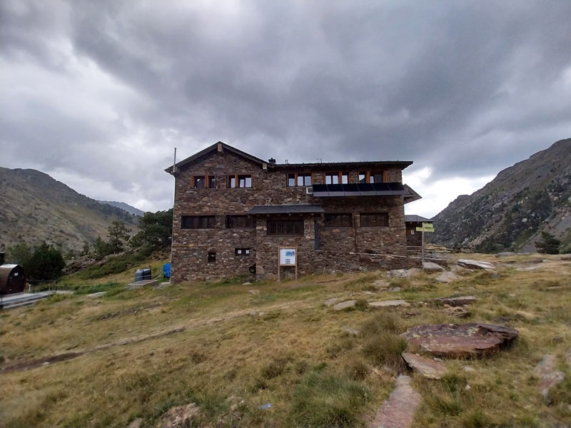 Je m’installe dans mon dortoir, je suis le premier arrivé, je peux choisir ma couchette, en bas et près de la fenêtre, comme je préfère. Je peux aller prendre ma douche tranquillement, on me donne un jeton mais attention je n’ai que 3 minutes ! 2 tchèques s’installent sur les couchettes près de moi, il faut bien que je les prévienne que je risque de ronfler ! Ils n’ont pas le choix, c’est la vie des refuges ! Finalement nous serons peu nombreux au refuge, une dizaine. Pour le repas c’est spécial on nous appelle pour nous remettre notre plateau. D’habitude on est rassemblés sur une table et on nous amène les plats. Du coup chacun mange dans son coin. Bon j’essaie d’engager la conversation avec 2 filles de mon dortoir, des métisses, elles me disent qu’elles vont faire aussi le Coma Pedrosa, mais la discussion ne va pas plus loin. Je me demande si ce sont 2 sœurs ou une mère et sa fille… Pendant le repas deux autres groupes arrivent, des allemands il me semble, ils sont trempés évidemment. Je suis le seul français, la plupart sont des espagnols, et même des catalans. Je vais me coucher tôt, je suis crevé et de toutes façons j’ai pas grand-chose à faire d’autre. J’entends la pluie, j’espère que demain ça va se calmer. Normalement il est prévu beau temps le matin, et pluie voire orage l’après-midi.
