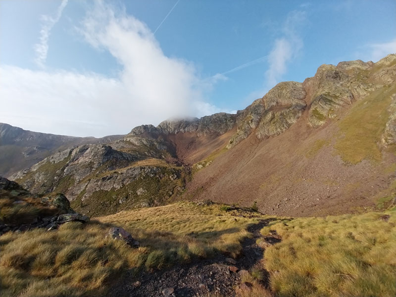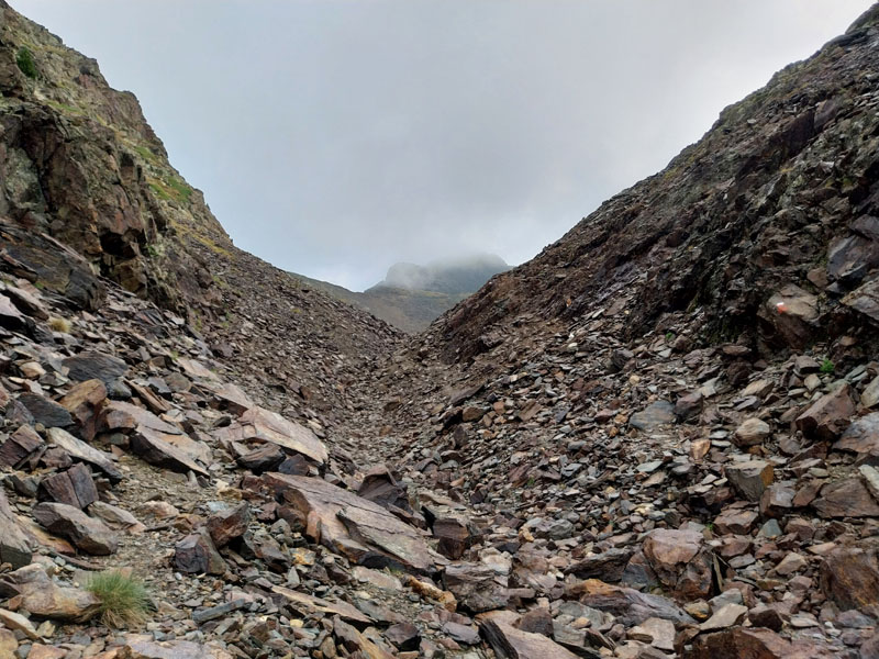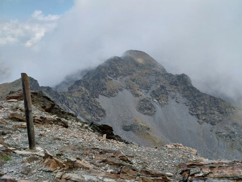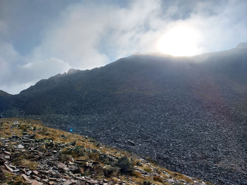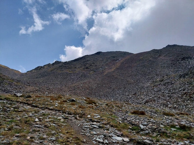 Le matin je prends mon petit-déj le plus tôt possible et décolle avant 8h. Je suis le premier du refuge à m’élancer il me semble. J’ai laissé des affaires pour alléger mon sac à dos. Il fait beau, mais jusqu’à quand ? Le panneau près du refuge indique 2h10 pour le sommet, mais je sais bien que je vais mettre plus que ça, peut-être 3h. Je traverse d’abord un bout de forêt puis retrouve le sentier dans le vallon un peu plus bas, qui commence à monter de plus en plus, puis qui tourne à angle droit à droite et devient bien plus raide. Les 2 métisses m’ont rattrapé et me doublent alors que je peine dans ce raidillon. Puis c’est le tour des tchèques. Il y a également un groupe de 4 jeunes filles espagnoles qui étaient au refuge et qui sont pas loin derrière.