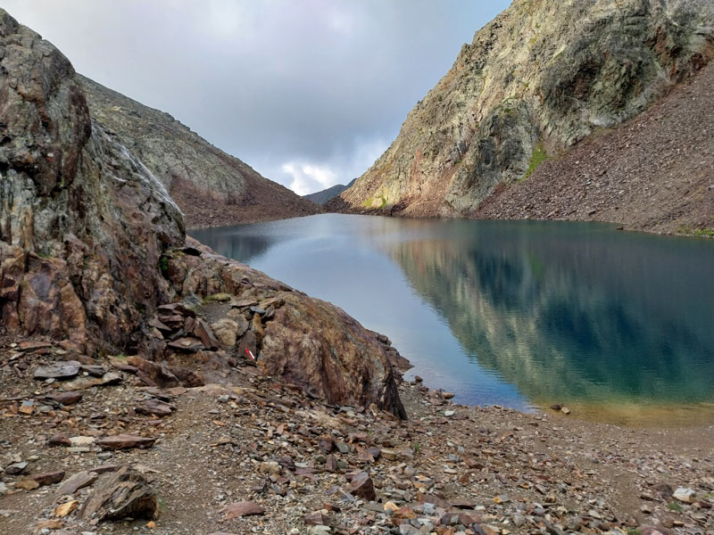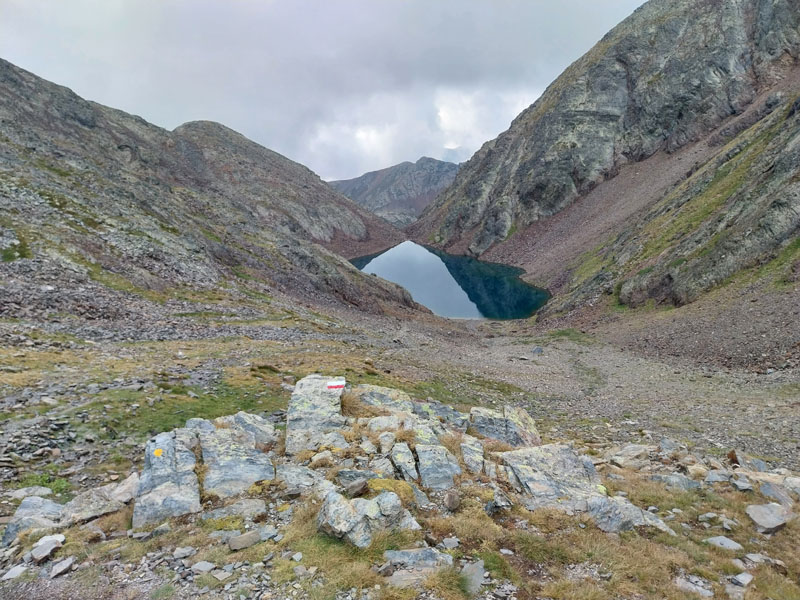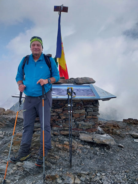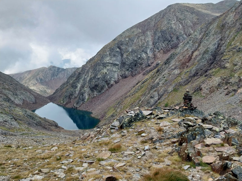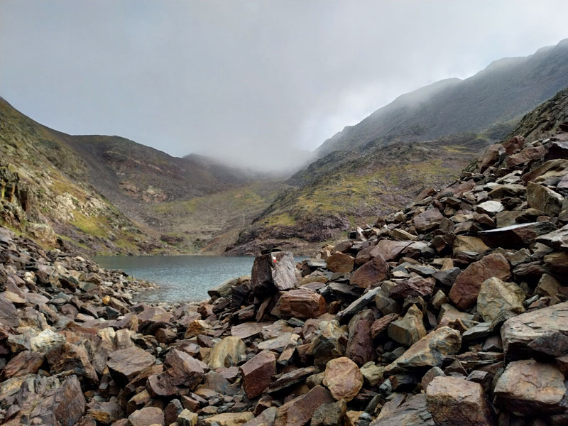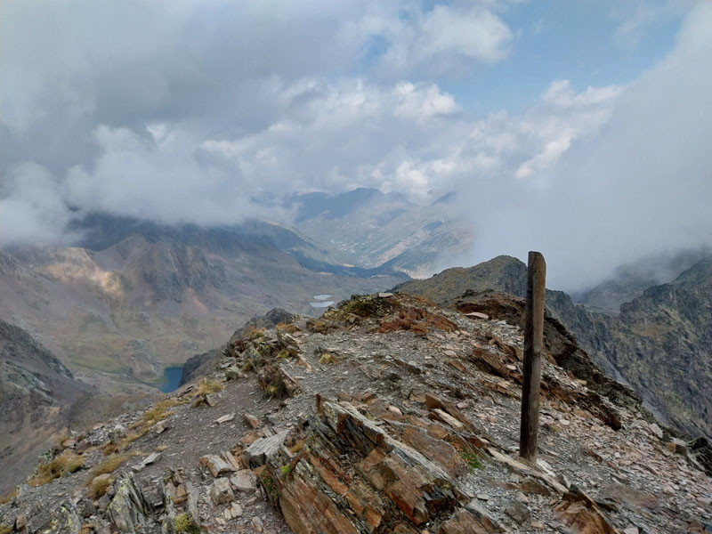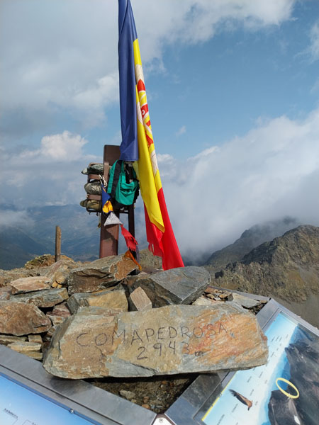 Après ce raidillon je traverse des éboulis de rochers et arrive à un lac que l’on longe pour ressortir à l’autre bout et reprendre la montée. Quand je suis au bout du lac je vois les 4 filles qui se sont trompées et qui sont montées sur un versant, et qui redescendent pour retrouver le sentier. C’est pourtant bien balisé, comment se tromper ?! Ça grimpe encore un moment, je vois le sommet sur ma droite, et j’arrive à une intersection où un panneau m’indique le sommet à 30 mn. C’est le passage le plus difficile, ça monte raide dans la caillasse et les blocs de rocher. Je croise les 2 métisses qui sont sur la descente, elles me disent que je suis à 5 mn. Je finis par arriver au sommet du Pic de Coma Pedrosa (2944 m) où est construit un monument en pierre avec le drapeau de l’Andorre. J’ai mis 2h45 et jen ai bavé ! Les 2 tchèques sont encore là, l’un d’eux me prend en photo, puis ils s’en vont. Peu après ce sont les 4 espagnoles qui arrivent. Elles sont très sympas, on discute, je les prend en photo aussi. Au bout d’un quart d’heure je commence à redescendre. Un panneau indique 1h40 pour le refuge… Tu parles ! Je vais mettre 2h30.