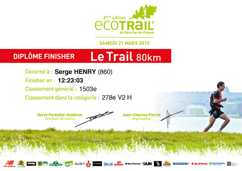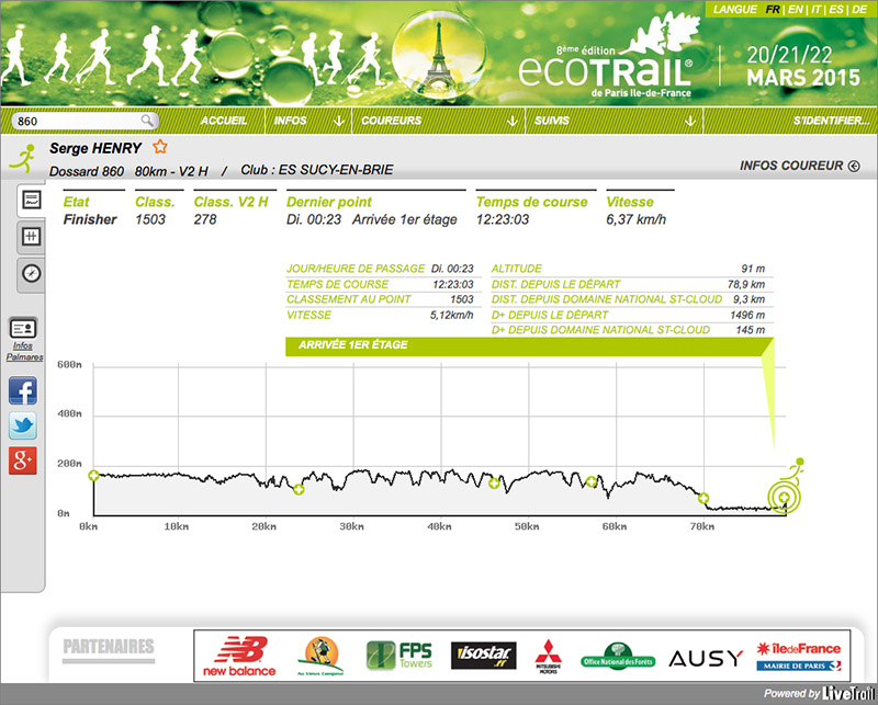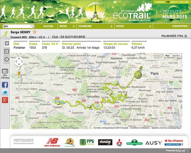 Je traverse la forêt domaniale de Meudon et son Parc de l’Observatoire. C’est là qu’il y a un contrôle sur le matos et que je mets ma frontale. Enfin j’arrive au ravito du 56e km vers Chaville, là où j’avais abandonné. Cette fois il n’est pas question d’abandon, d’ailleurs je ne m’attarde pas et je repars illico !
