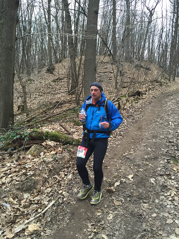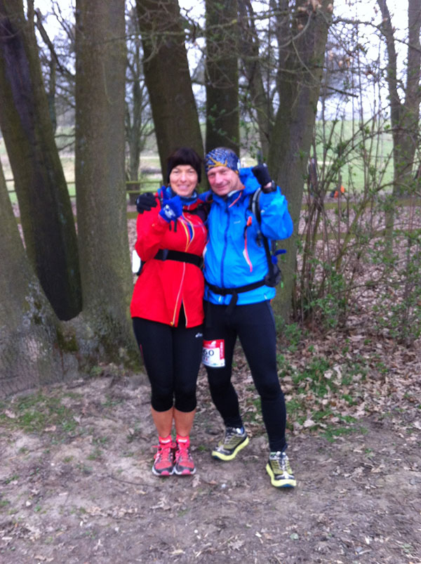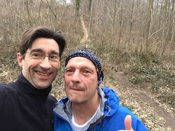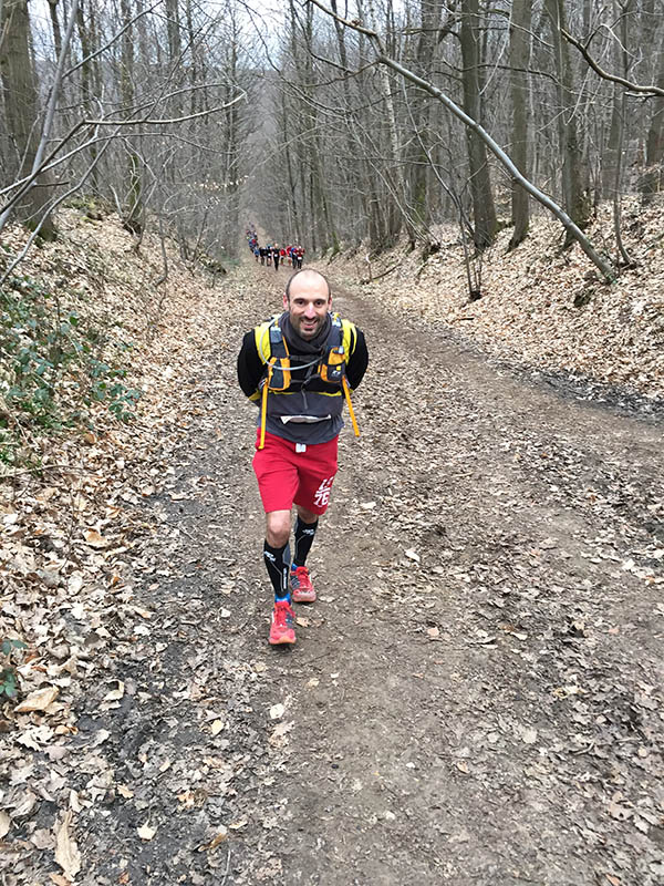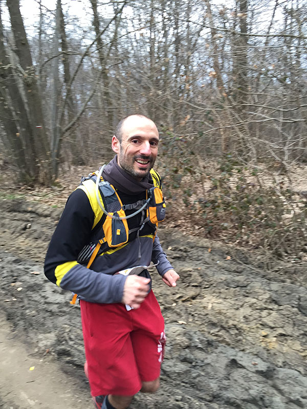 Dès le départ je prends mon rythme, Laura aussi, et je la perd de vue. Je retrouve le parcours et les lieux traversés en 2011, l’étang de Saint-Quentin, la forêt domaniale de Versailles, où je fais la rencontre d’André, un autre pote collègue qui ne court pas mais qui nous avait informé qu’il serait sur le parcours pour nous encourager. Ça fait vraiment plaisir de le voir, surtout que depuis un moment je suis pas très bien, j’ai froid et pas trop le moral… On discute quelques instant, il me dit que Aurélien est déjà passé, normal il a un meilleur niveau. Je change de t-shirt, on se fait un petit selfie et c’est reparti ! Mine de rien cette rencontre m’a requinqué.
