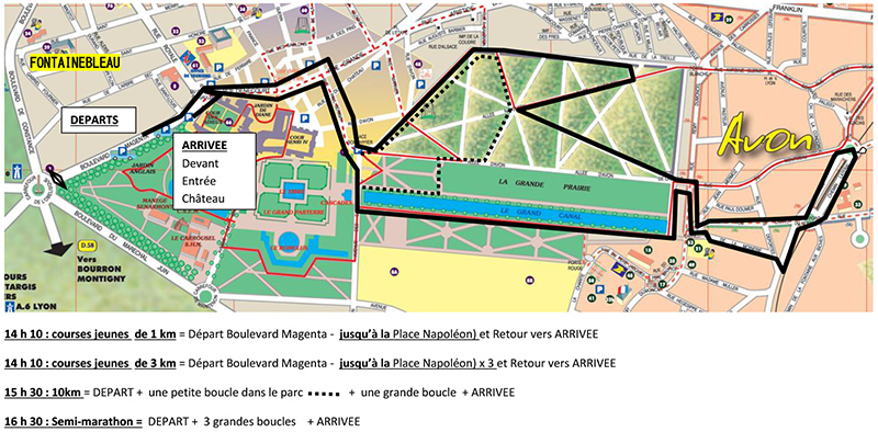 Le parcours consiste toujours en 2 boucles, quoiqu’un peu différentes, dans les rues et dans le parc du Château de Fontainebleau.