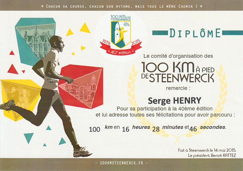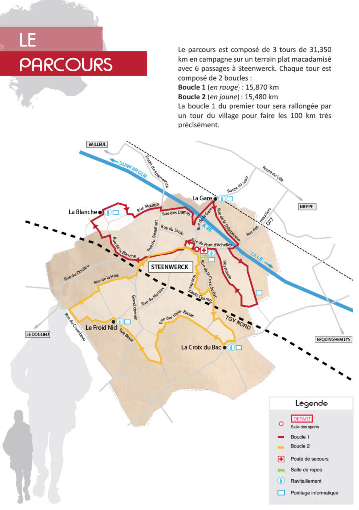 C’est reparti pour mon 100 bornes annuel, le 5e en 5 ans. J’ai opté pour celui de Steenwerck, qui fête d’ailleurs sa 40e édition. L’organisation propose 2 épreuves de 100 km, l’Open dont le délai est de 24 h, comme à Millau, ce qui est large et me convient, que l’on peut faire également en relais par équipe de trois. Et le 100 km Course, avec un délai de 13 h, pour les athlètes confirmés. Évidemment je vais faire l’Open, je vais prendre mon temps…