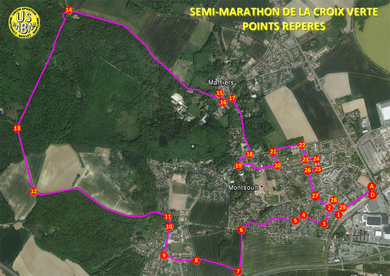 Le parcours est en une seule boucle, sur des petites routes de campagne qui vont traverser les communes de Monsoult, Baillet-en-France, Nerville-la-Forêt et ses chemins forestier de la forêt de l’Isle-Adam, et Maffliers pour revenir à Monsoult.