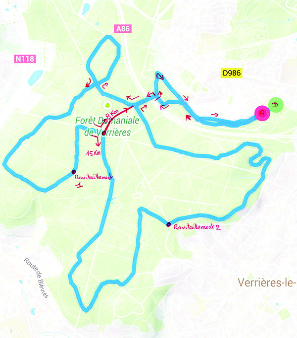 Départ près du gymnase Thomas Masaryk, en légère montée, puis nous partons dans la forêt et prenons une passerelle au-dessus de l’A86 pour aller dans la Forêt Domaniale de Verrières. Beau parcours, quand même assez exigeant avec les successions de côtes, faux-plats, descentes… On passe sous le pont de l’A86, des escaliers à la fin, et on revient au gymnase.