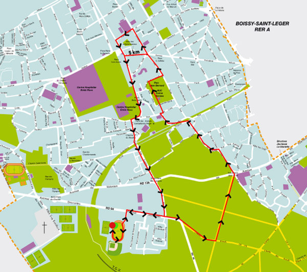 Le départ est donné sur la piste du stade et nous nous engageons sur l’avenue qui mène à un bois, que nous allons traverser sur quelques centaines de mètres. Quand nous en sortons nous descendons dans le centre de Limeil, puis nous remontons par une rue assez raide et qui me parait longue. En haut on retrouve l’avenue et on repart pour une deuxième boucle. En haut de la 2e montée on retourne vers le stade, pour un nouveau tour de piste.
